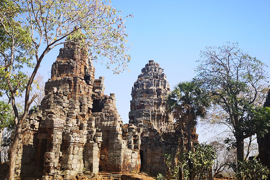 The temple consists of five towers arranged the five-pointed form reminiscent of Angkor Wat with the middle being the largest. To reach these towers and enjoy the magnificent panoramic view, you have to climb up 358 steep steps but it is definitely worth a look. At the top are stunning scenery of Sanger River amid sugar palm trees and the breathtaking view of the surrounding countryside, with small villages dotting the endless rice paddies. To the south, you will admire a mountain range that features a crocodile shaped mountain, and to the northwest Phnom Sampeau. In spite of some looting, the temple still comes in a considerably better state of repair. Several delightfully carved lintels remain above some of the towers doorways, others are now displayed in the Battambang Museum.